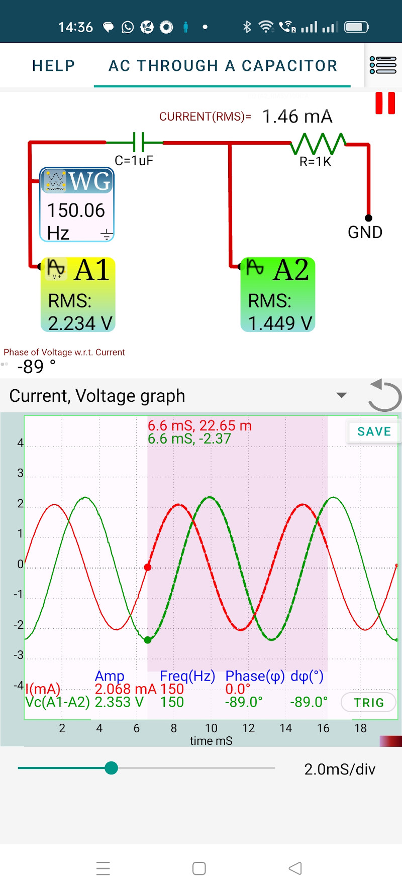 - Observe that the current (A2) is at its peak when the voltage across the capacitor ($A1-A2$) is at zero, confirming the $90^\circ$ phase shift.