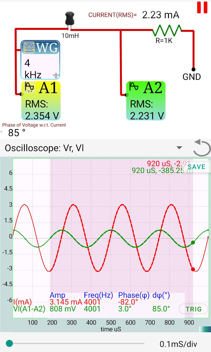 - Frequency Selection: At low frequencies, $X_L$ is small compared to $R_L + R$, making the phase shift difficult to measure accurately. Always use higher frequencies ($>2\text{ kHz}$) for small inductors.