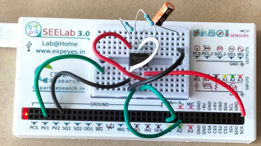 - Open the SEELab3 / ExpEYES app and navigate to the “IC 555 Astable” experiment or use the oscilloscope directly.