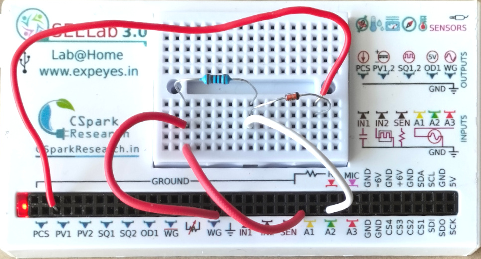 - Connect the other end of $R$ to the anode of the diode. This junction is the output node — connect it to A2.