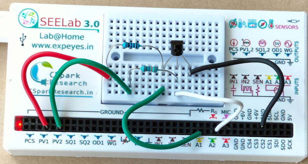 - Connect PV2 → $R_B$ ($100\text{ k}\Omega$) → Base of 2N2222. Connect A2 at the Base.