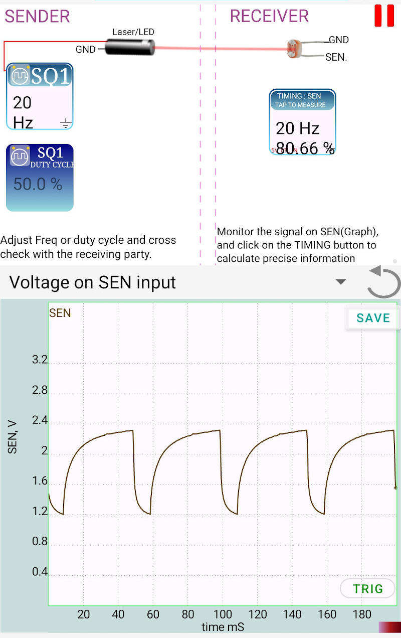 4. Analysis: Tap on the SEN icon. The software will display the frequency and duty cycle of the received signal. Verify that it matches the SQ1 settings.