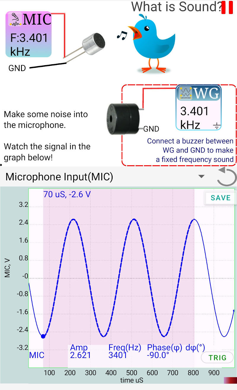 - Signal Capture: Observe the waveform on the MIC channel while the buzzer is sounding. Compare its frequency with the WG frequency.