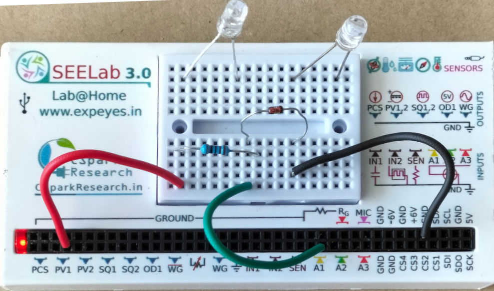 - Connect A1 across the diode — anode to A1, cathode to GND — to measure $V_D$.