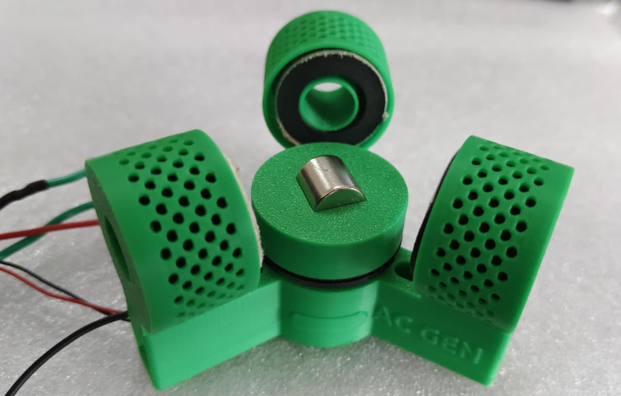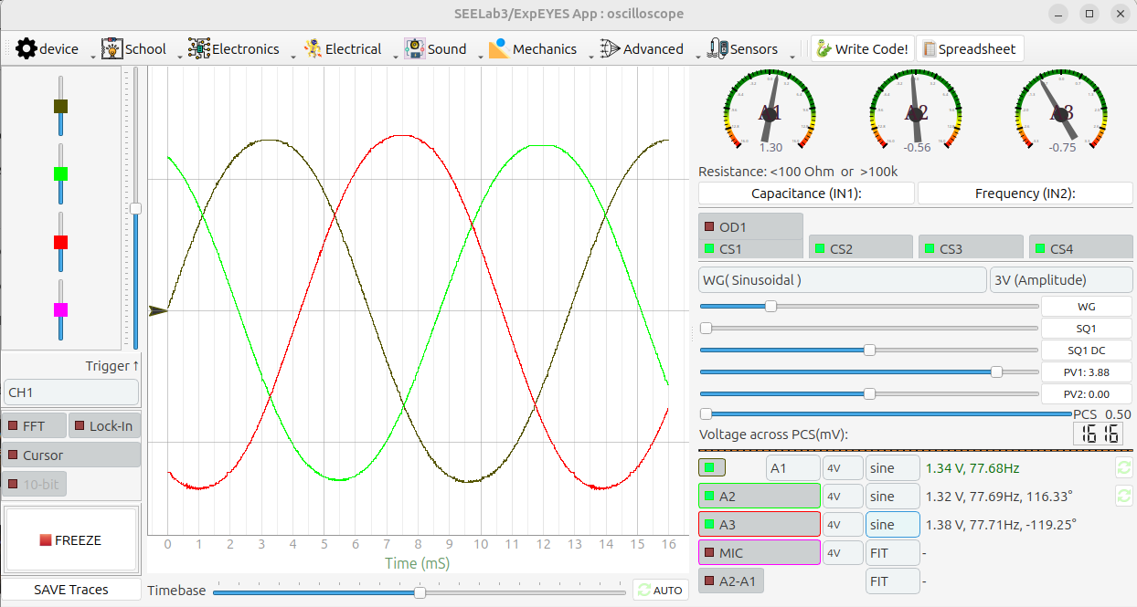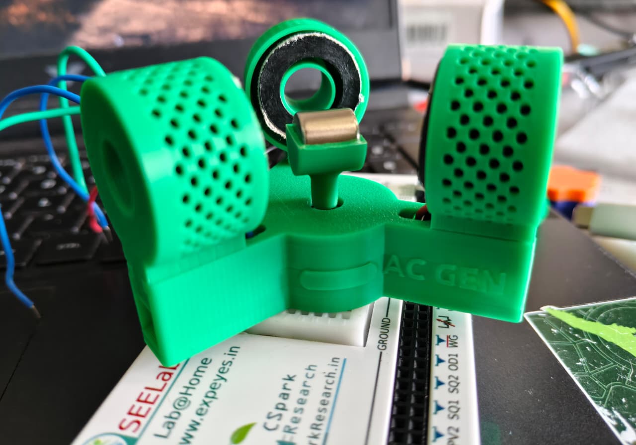 The spinning magnet creates 3 sine wave voltages in the coils which is studied with SEELab3