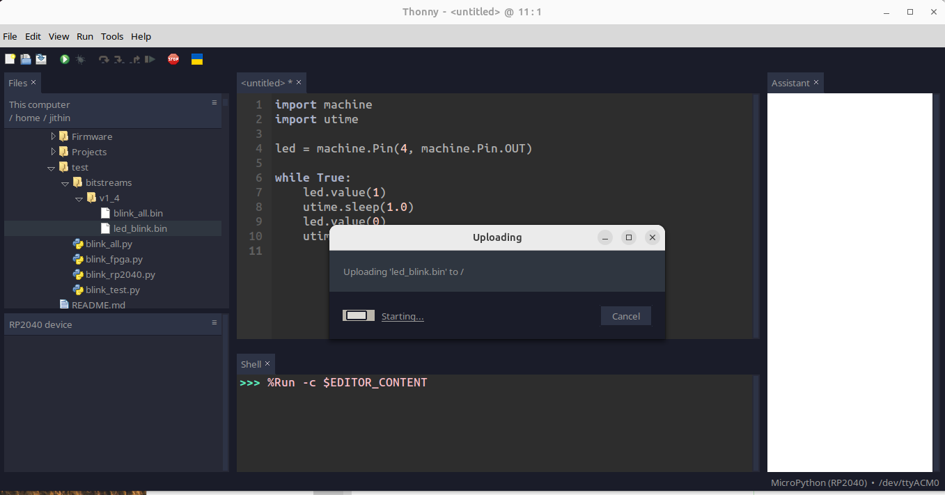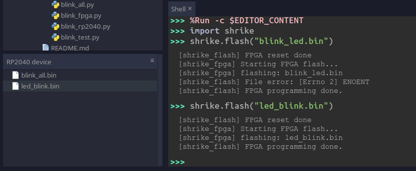 In the RP_2040 terminal (This is micropython on the RP2040 now. not your system interpreter), upload the .bin to the FPGA. Don’t forget to verify the filename :p